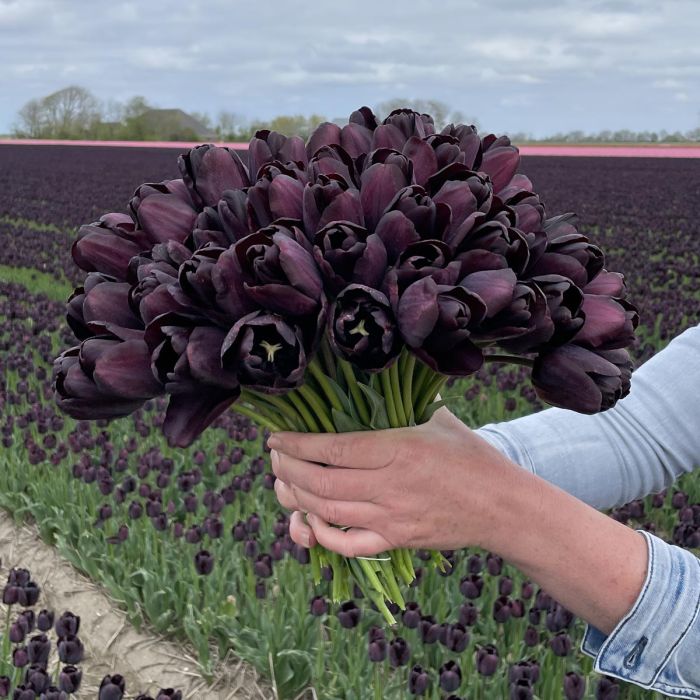 Глибокий, майже чорний відтінок пелюсток із фіолетовим блиском виглядає розкішно як у саду, так і в букетах. Це справжня “чорна перлина” серед тюльпанів.