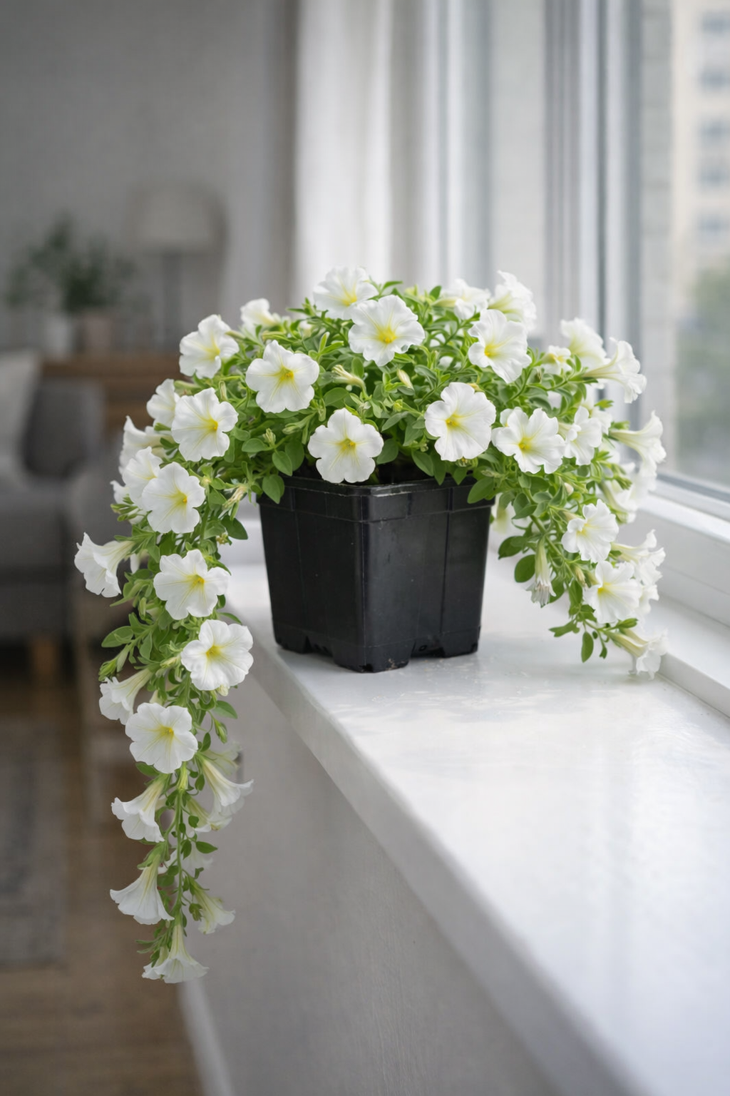Каскадна петунія на підвіконні: охайний ріст і перші хвилі цвітіння.
