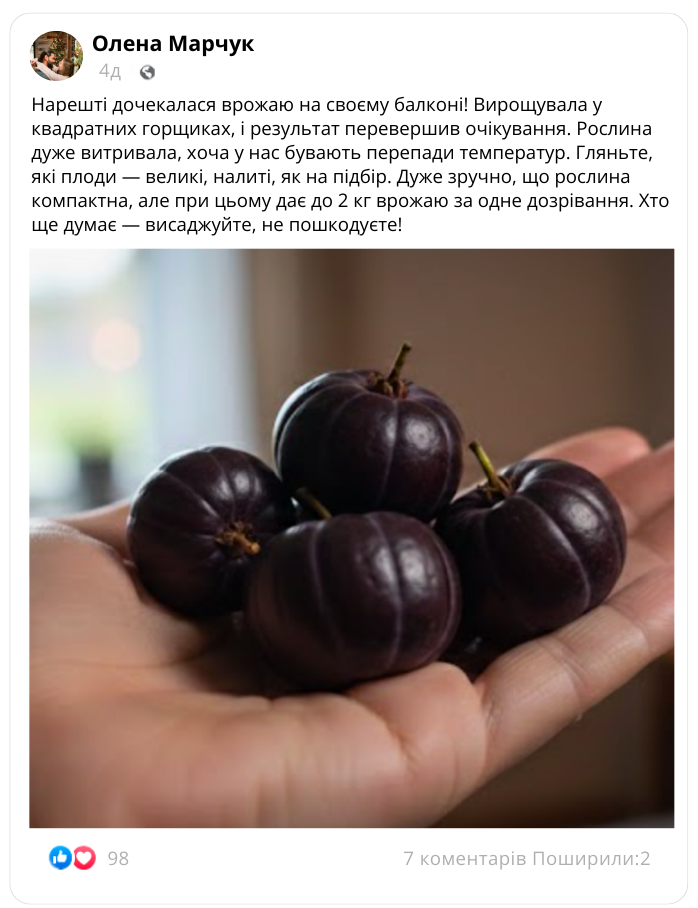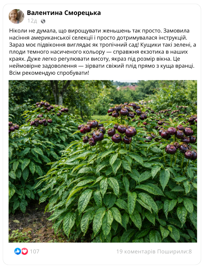 На відміну від звичайних сортів, цей женьшень дає солодкі та соковиті плоди, які є природним джерелом енергії та зміцнюють імунітет.